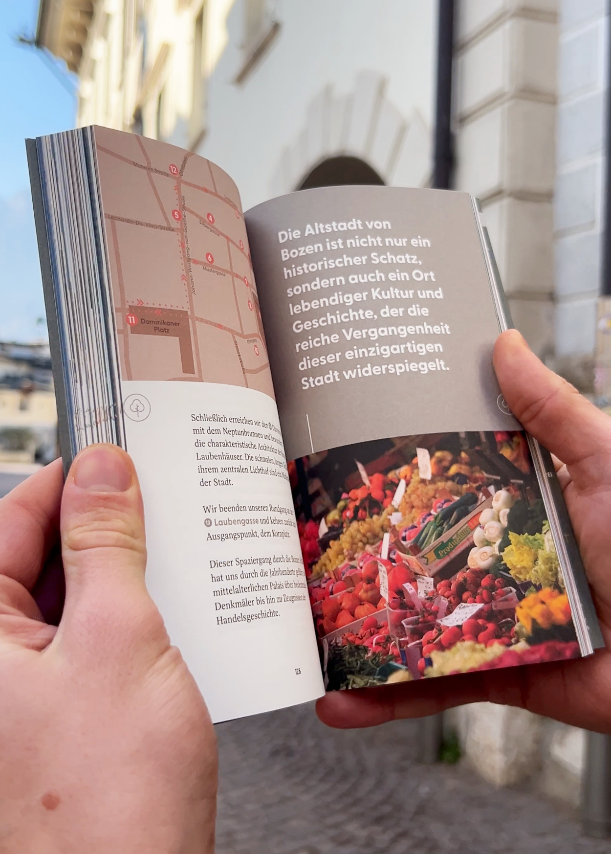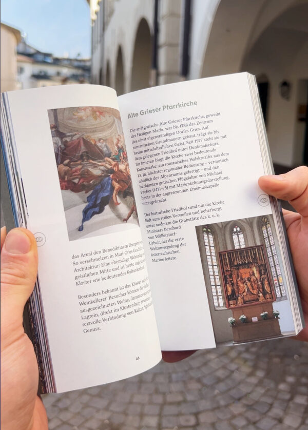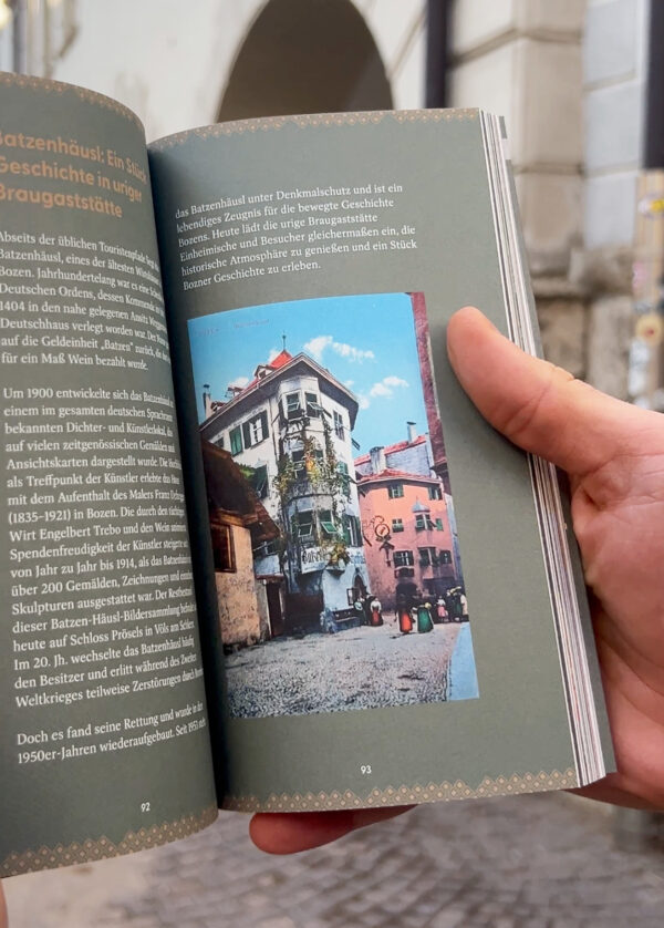 Der kompakte Guide vereint informative Inhalte mit gestalterischer Finesse: Historische Miniaturen, Tipps zu Gastronomie, Einkaufsmöglichkeiten und Ausflügen in die Umgebung werden durch visuelle Akzente unterstützt, die den Leser:innen Lust aufs Entdecken machen. So entsteht ein Stadtführer, der nicht nur informiert, sondern Bozen als Erlebnis inszeniert.