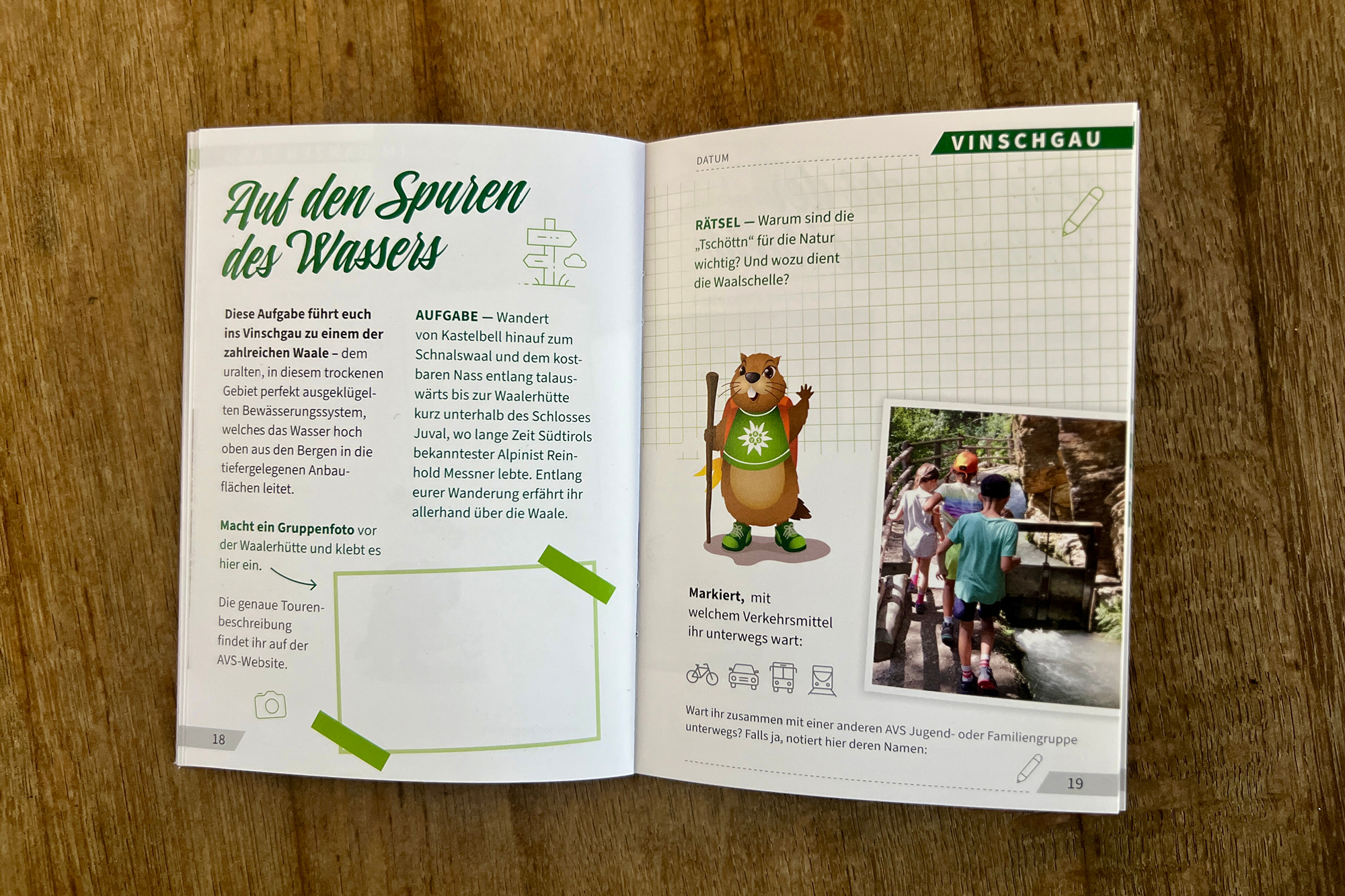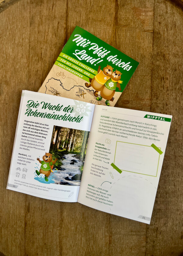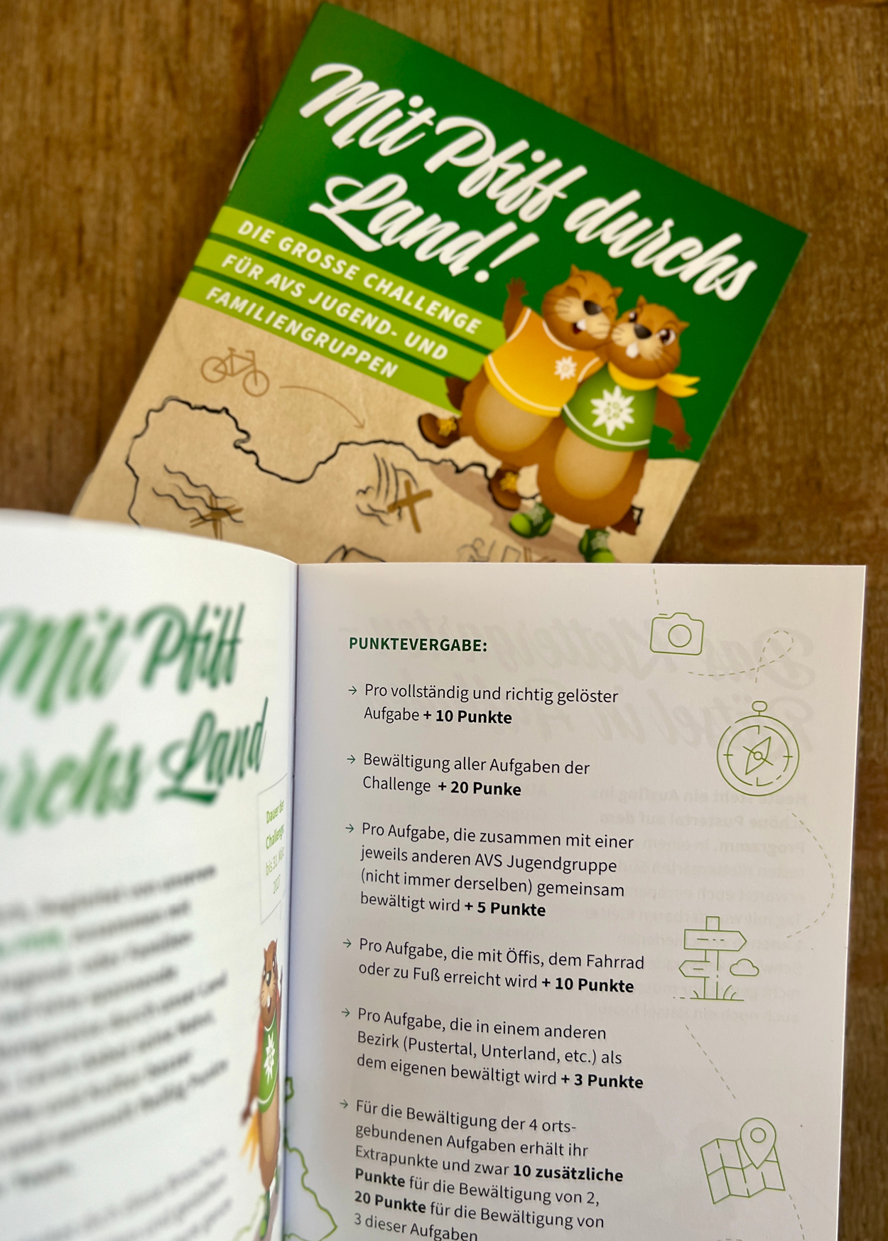 Mit dabei ist Maskottchen Murmele Pfiff, das gemeinsam mit den Jugend- und Familiengruppen auf eine spannende Entdeckungsreise geht. Unterwegs lernen die Teilnehmenden Natur, Geschichte und Kultur kennen und sammeln dabei fleißig Punkte für ihr Team. Die Broschüre begleitet sie durch das Abenteuer und bietet Platz, um eigene Erlebnisse, Eindrücke und Erinnerungen festzuhalten.