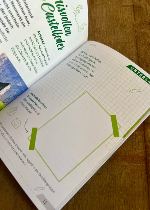 Gestaltet im Scrapbook-Stil, lädt die Broschüre Kinder und Jugendliche dazu ein, selbst kreativ zu werden: Rätsel lösen, Bilder einkleben oder persönliche Eindrücke festhalten – alles ist erlaubt.